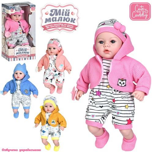 4014М-1 Пупс 45см м’яконабивний.4види.музика/звук(укр).вірш.пісня.4види.бат(табл).кор.23-43-16см